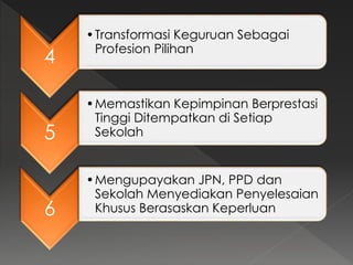 Memanfaatkan ICT bagi meningkatkan kualiti pembelajaran di Malaysia 8. Mengupayakan Jabatan Pelajaran Negeri Pejabat Pelajaran Daerah dan sekolah menyediakan penyelesaian khusus berasaskan keperluan 7. Memastikan pemimpin berprestasi tinggi ditempatkan di setiap sekolah.